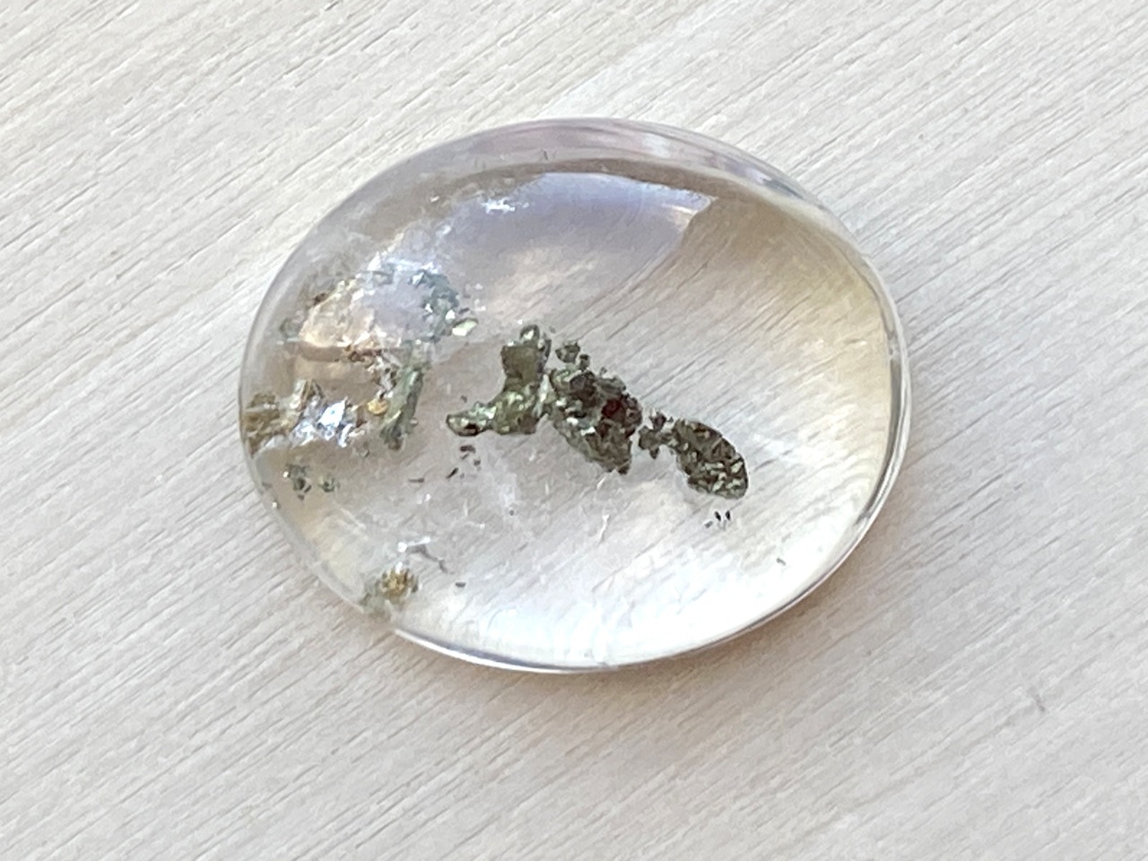 透明感のある水晶の中に、パイライトが美しく輝くルースです。